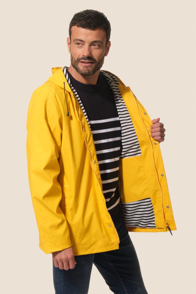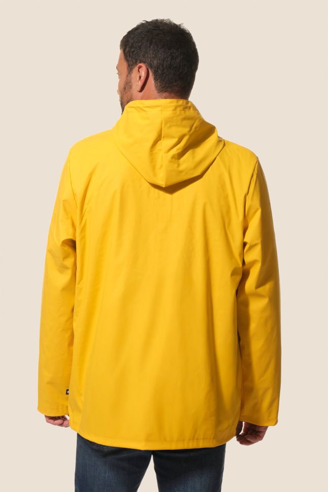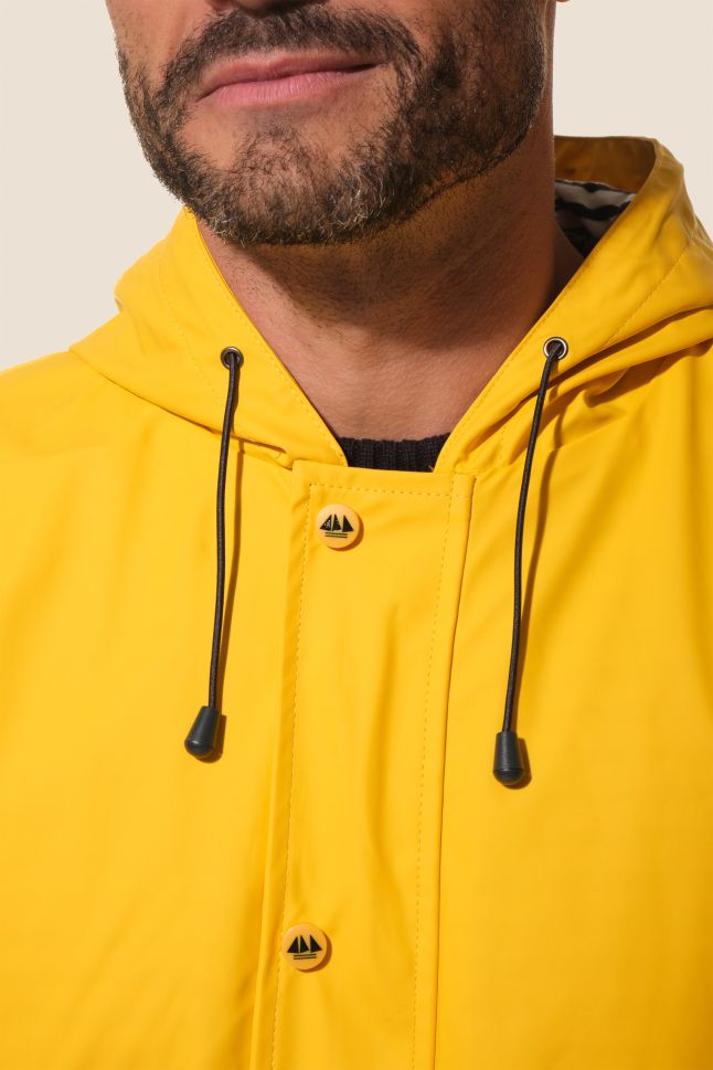 Късо унисекс непромокаемо яке Права кройка Подплатено с раиран трикотаж Качулка с подплата от раиран трикотаж и еластична връзка Преден цип и копче с тик-так копче Два предни джоба с кант Един вътрешен джоб Водоустойчивост: 4000 мм воден стълб Предлага се в няколко цвята