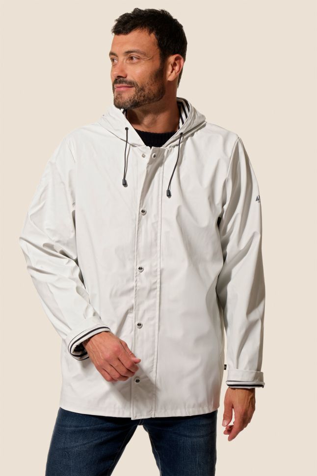 Емблематично унисекс непромокаемо яке Nuage съчетава стил и функционалност с правата си кройка и раирана подплата от трико. Подплатената му качулка с еластична връзка, закопчаването с цип и копче тип „тик-так“, джобовете с кант и вътрешният джоб осигуряват комфорт и практичност.