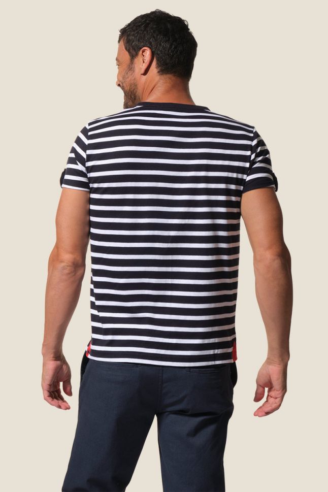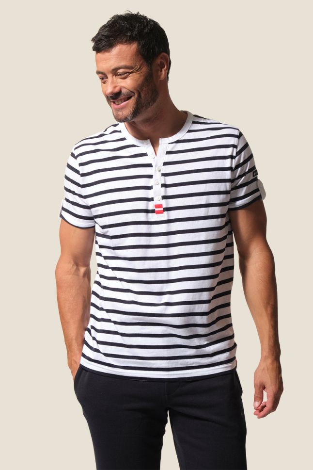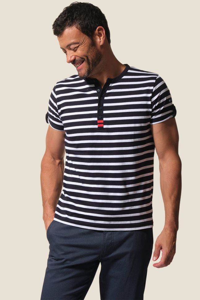 Мъжка тениска с къс ръкав и тунизийска яка, вдъхновена от непринудения чар на Френската Ривиера. Изчистен силует, естествена 100% памучна материя и усещане за лекота и стил. Перфектният избор за модерния мъж, който цени комфорта и елегантната небрежност.