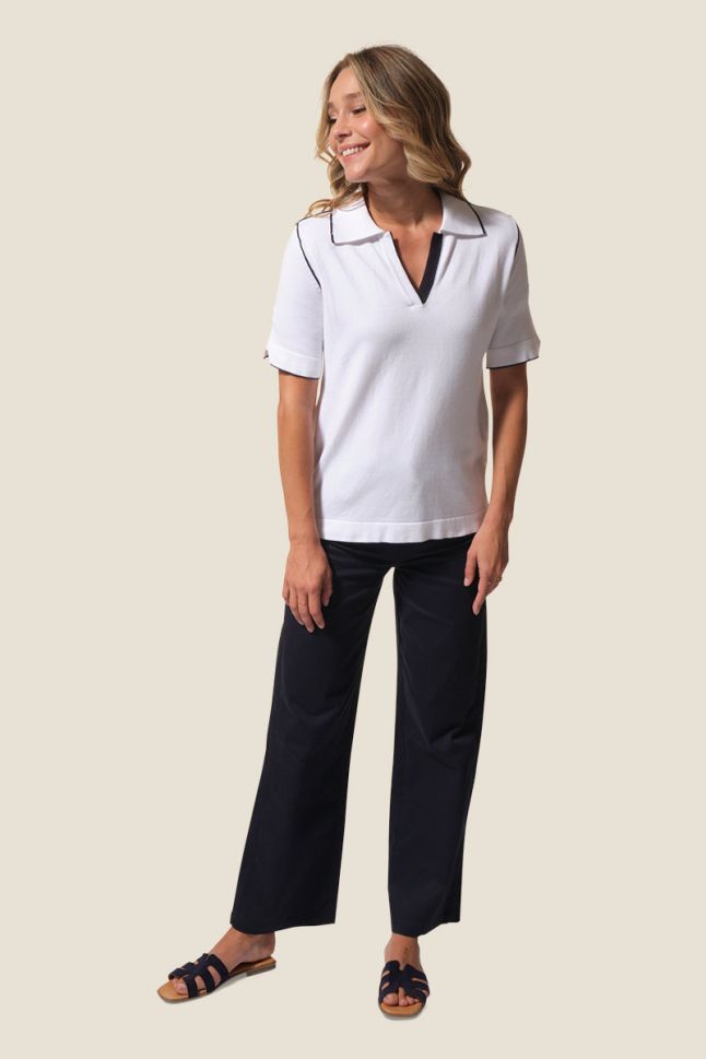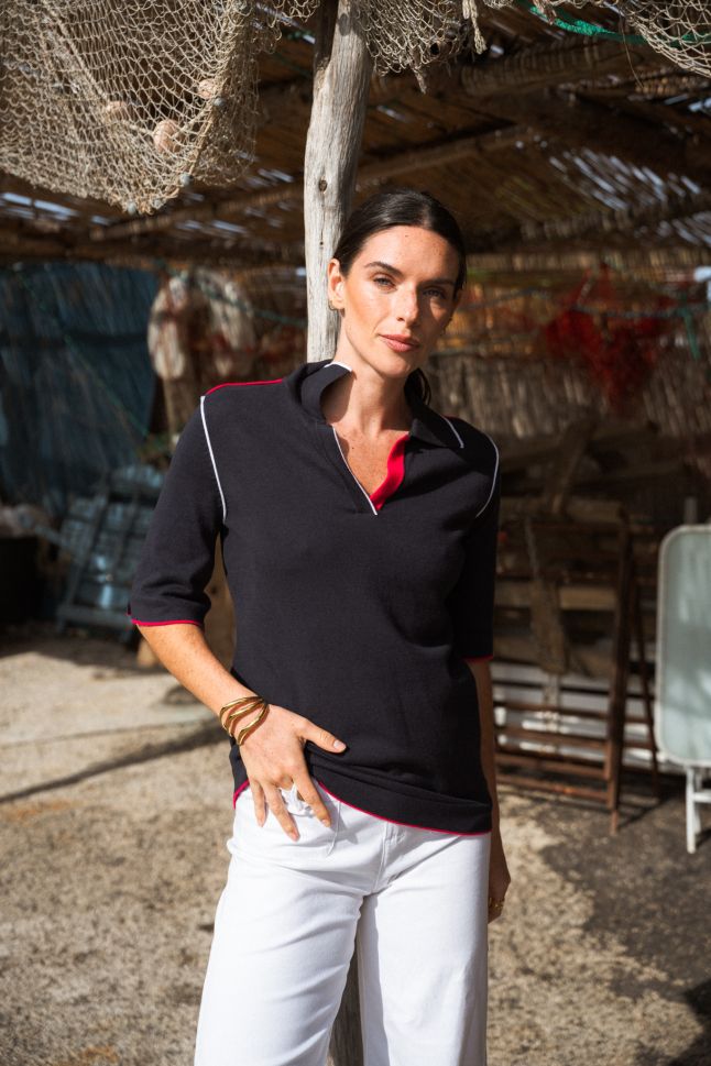 Дамска тениска Jackie с поло яка и игрив дизайн с цветови вариации. Вдъхновена от стила на Френската ривиера, Jackie носи усещане за лекота, слънце и морски бриз. Елегантна и удобна, тя е идеална за летни разходки и ежедневна визия с фин френски чар. Комбинира се лесно както с панталон, така и с пола за стилна и женствена визия.