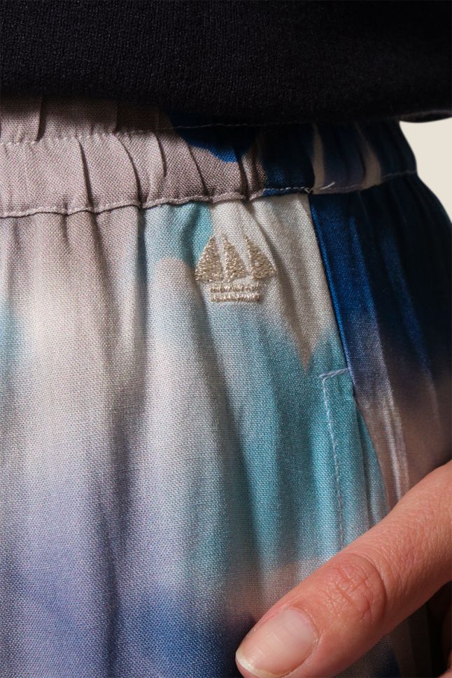 Дамски панталон с елегантен флорален принт и леко разширена кройка на крачола. Моделът е с удобен ластичен колан и практични странични джобове, допълнен с фино златисто бродирано лого отпред. Изработен от 100% вискоза – лека, мека и приятна на допир материя, идеална за пролетно-летния сезон. 🌸