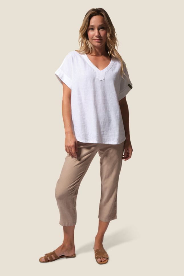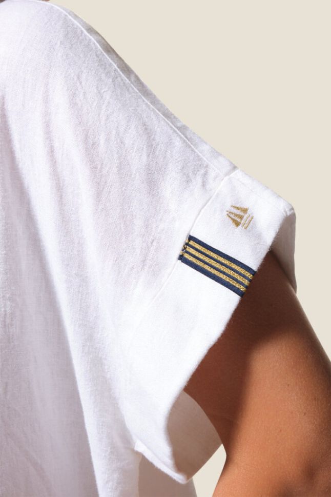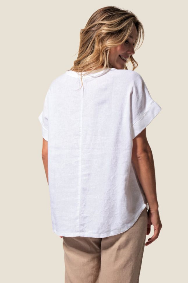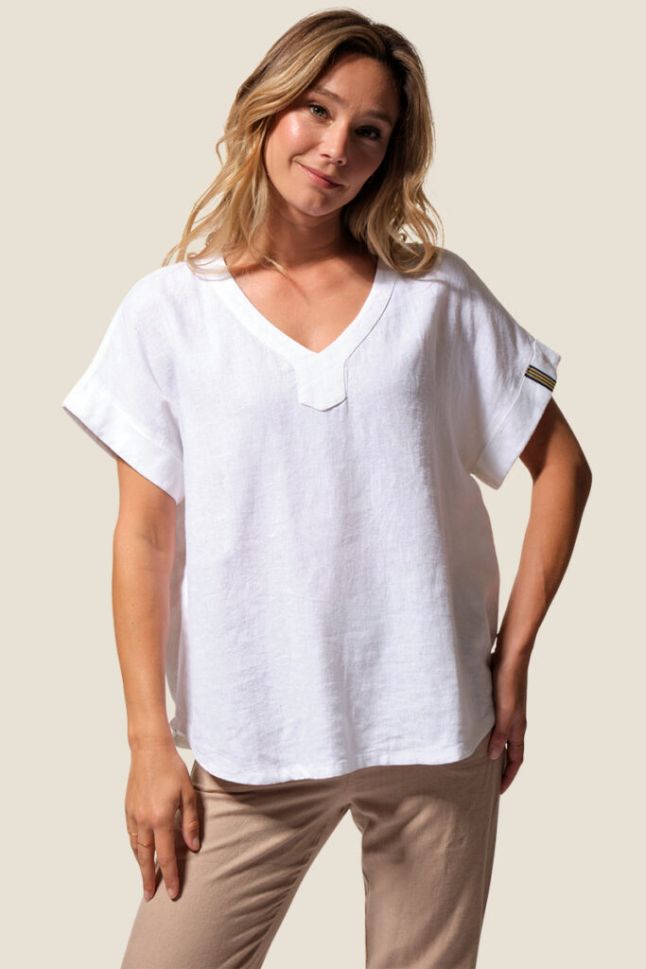 Лека и стилна дамска блуза Dominique с къс ръкав и елегантно V-образно деколте. Моделът е със заоблен подгъв отпред и отзад, декоративен шев по средата на гърба и фиксирани подгънати ръкави за небрежен шик. Фината бродерия на левия ръкав придава завършен акцент. Изработена от комбинация вискоза и лен, осигурява комфорт и прохлада през топлите дни.