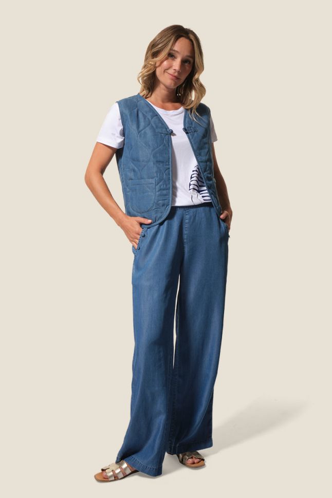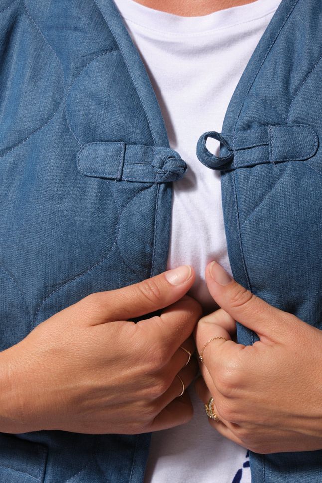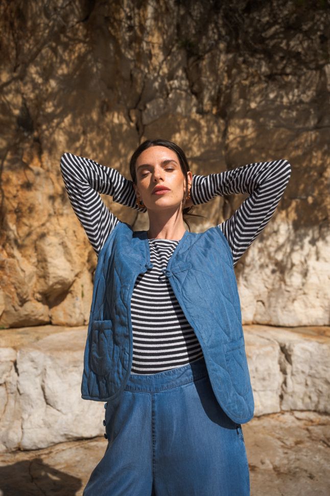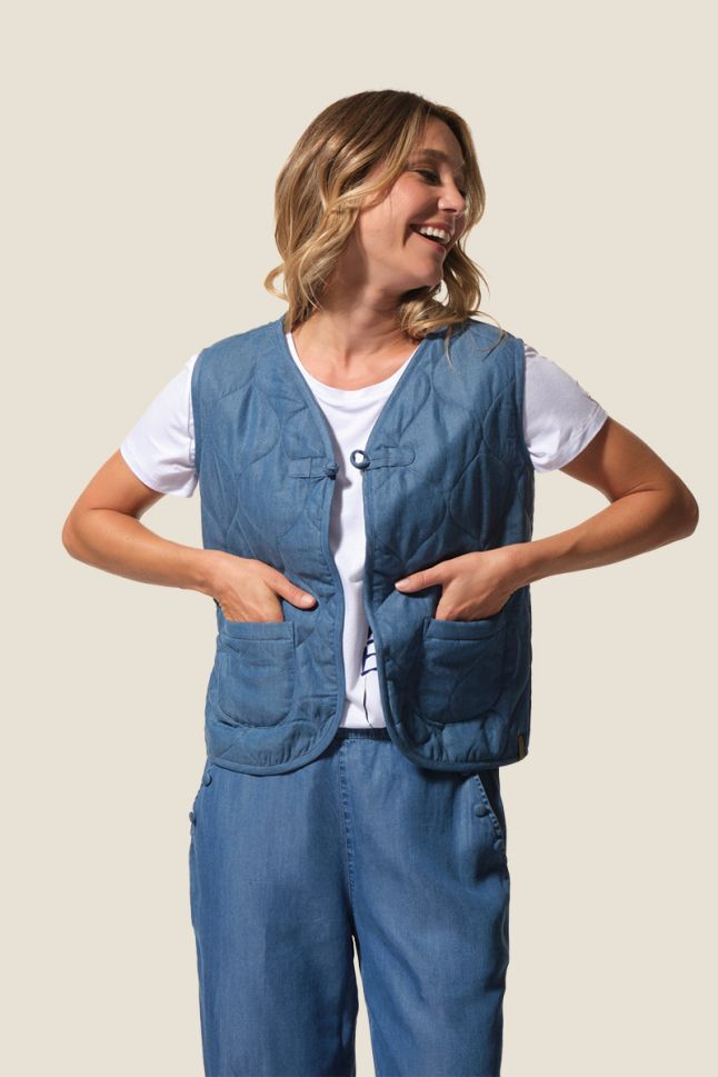 Стилен ватиран дамски елек Magalie от мек Tencel, съчетаващ комфорт и елегантност. Моделът е със заоблено V-образно деколте, ефектно закопчаване и декоративна раирана подплата. Лек и удобен, перфектен за модерни многослойни визии.