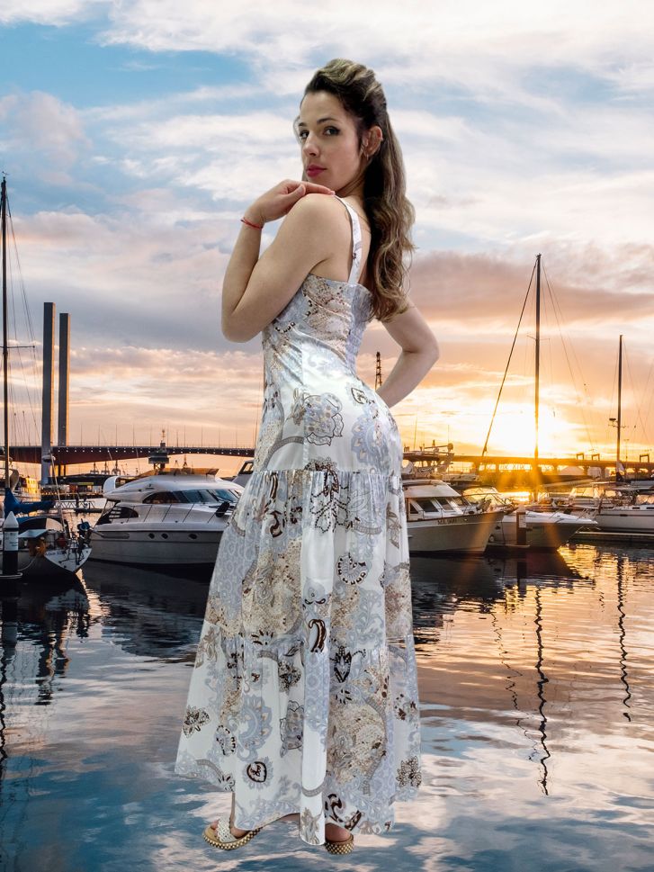 Рокля Sissi съчетава лукс и свобода – сатинирана вискоза, ефирна лятна кройка с презрамки и винаги актуален принт. Перфектна за ежедневие и звездни моменти на бийч бара.